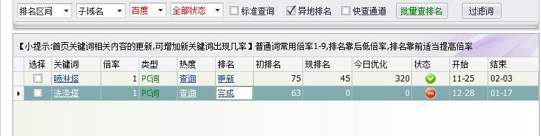 通过我们公司的软件可以很清楚的看到网站关键词的排名情况,已经有1个关键词出现了排名,还有1个关键词一直不太稳定,排名时有时无。