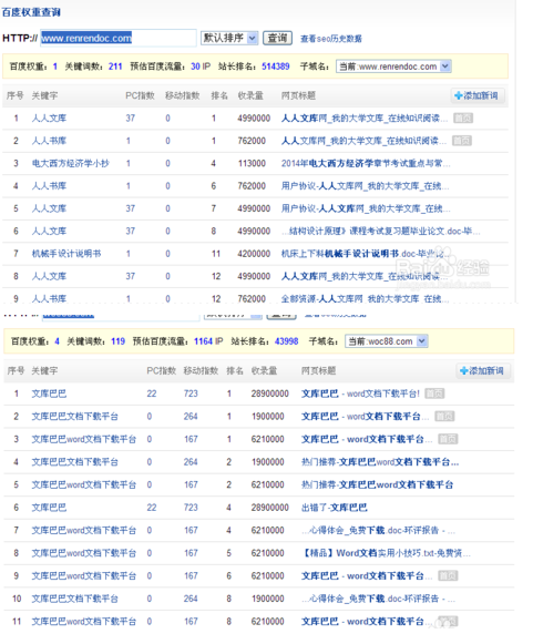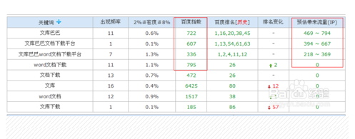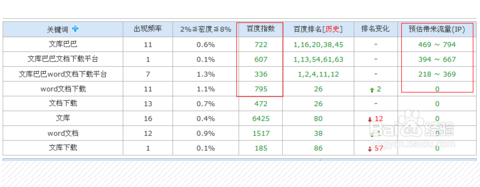 通过上面的分析,关健字百度指数高,流量就越高。理论上说是这样的,但给网站带来的预估流量,就根关键字的排名有关了。如下图:文库这个关健字的百度指数很高,但给网站的流量却为0,因为排名很差。